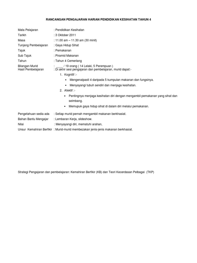 Rancangan Pengajaran Harian Pendidikan Kesihatan Tahun 4 Pdf